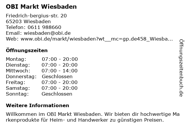 Sie finden OBI Markt Wiesbaden ffnungszeiten Adresse Wegbeschreibung und Karte Telefonnummern und Fotos. 20 65203 Wiesbaden Entfernung. Nchste OBI Filiale in Wiesbaden.